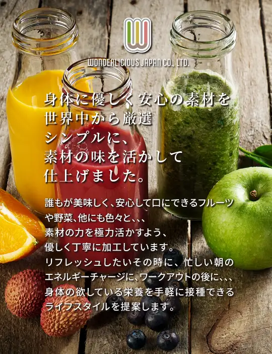 ナチュラルな美味しさ、心地よい満足感。新鮮で安心・安全な素材の味を活かすだけでなく美味しさにもこだわっています。毎日摂っていただきたいモノだから手間を惜しままず、美味しさを追求しています。きっと満足いただける豊かな恵みをお楽しみください。