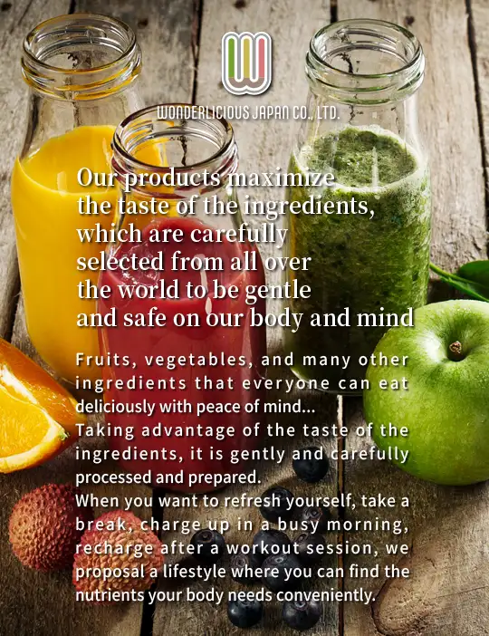 We appreciate all ingredients, and process freshly harvested, safe and healthy ingredients as quickly as possible while preserving their vitality and deliciousness. Enjoy the fresh taste of the blessings of nature.